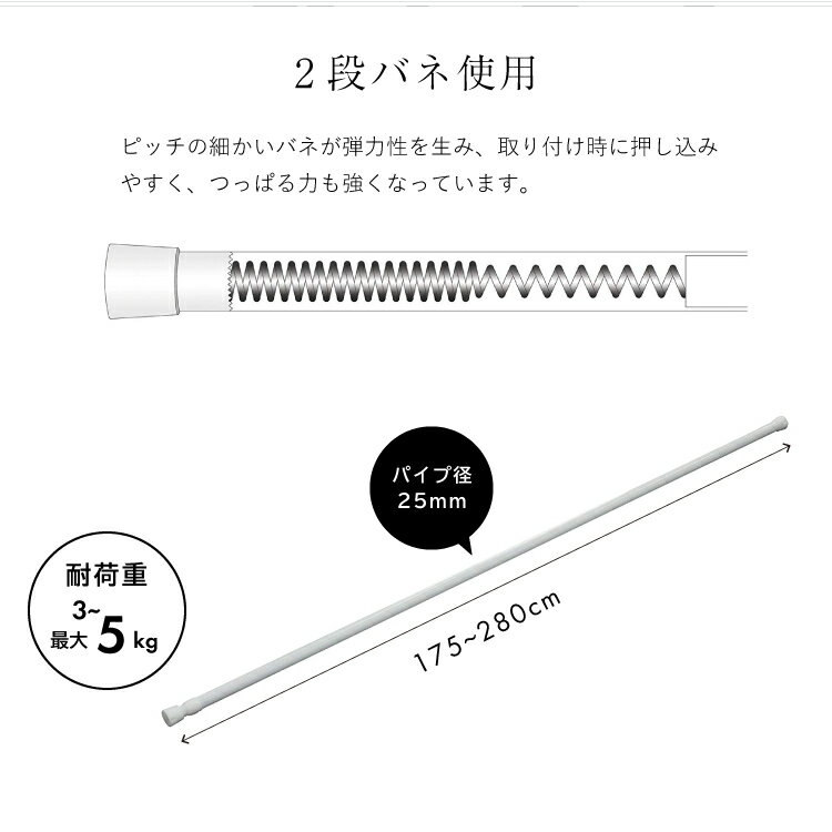 パイプ径 25.4-22.0mm 取付範囲 175-280cm 耐荷重 5〜3kg カラー 白 材 質 鉄パイプ(塩ビ被覆仕上げ)/合成ゴム/鉄(防錆油処理) このカテゴリーの商品一覧はこちら▶ずり落ちが心配な時には 別売の『強力支え棒』のご使用をおすすめします。